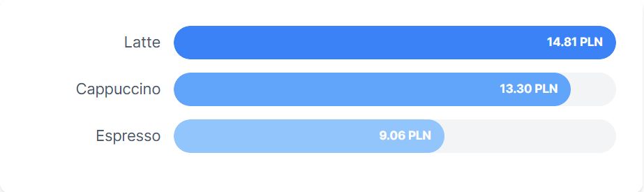 Wyniki pokazują, że espresso pozostaje punktem odniesienia dla kawy w Polsce. Średnia krajowa cena tego napoju wynosi 9,06 zł, przy czym w większości kawiarni waha się ona pomiędzy 8 a 10 zł. Kawy zawierające mleko okazały się wyraźnie droższe od espresso - średnia cena cappuccino wyniosła 13,30 zł (+47%), a latte 14,81 zł (+64%).