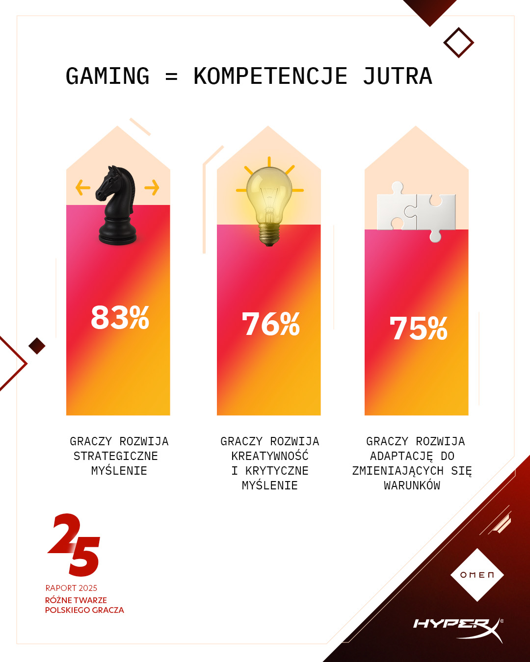 Już zeszłoroczne badania pokazały, że dzięki grom wideo gracze rozwijają ważne społecznie cechy. Co czwarta osoba deklarowała, że dzięki graniu staje się bardziej pewna siebie i łatwiej nawiązuje kontakty. Dane z tego roku pokazują, że ponad połowa polskich gamerów wykorzystuje kompetencje zdobyte w grach wideo do rozwiązywania problemów zawodowych. Aż 83 % badanych deklaruje rozwój strategicznego myślenia, 76 % kreatywności i krytycznego podejścia a 75 % umiejętności adaptacji do nowych technologii i dynamicznego rozwoju sztucznej inteligencji. Dodatkowo, około 2/3 badanych osób wskazuje, że gry wideo uczą pracy zespołowej i rozwijają zdolności przywódcze. Zdecydowana większość myśli też, że kompetencje zdobywane w grach wideo będą coraz bardziej doceniane przez pracodawców (jedynie 5% ankietowanych nie zgadza się z tym założeniem).