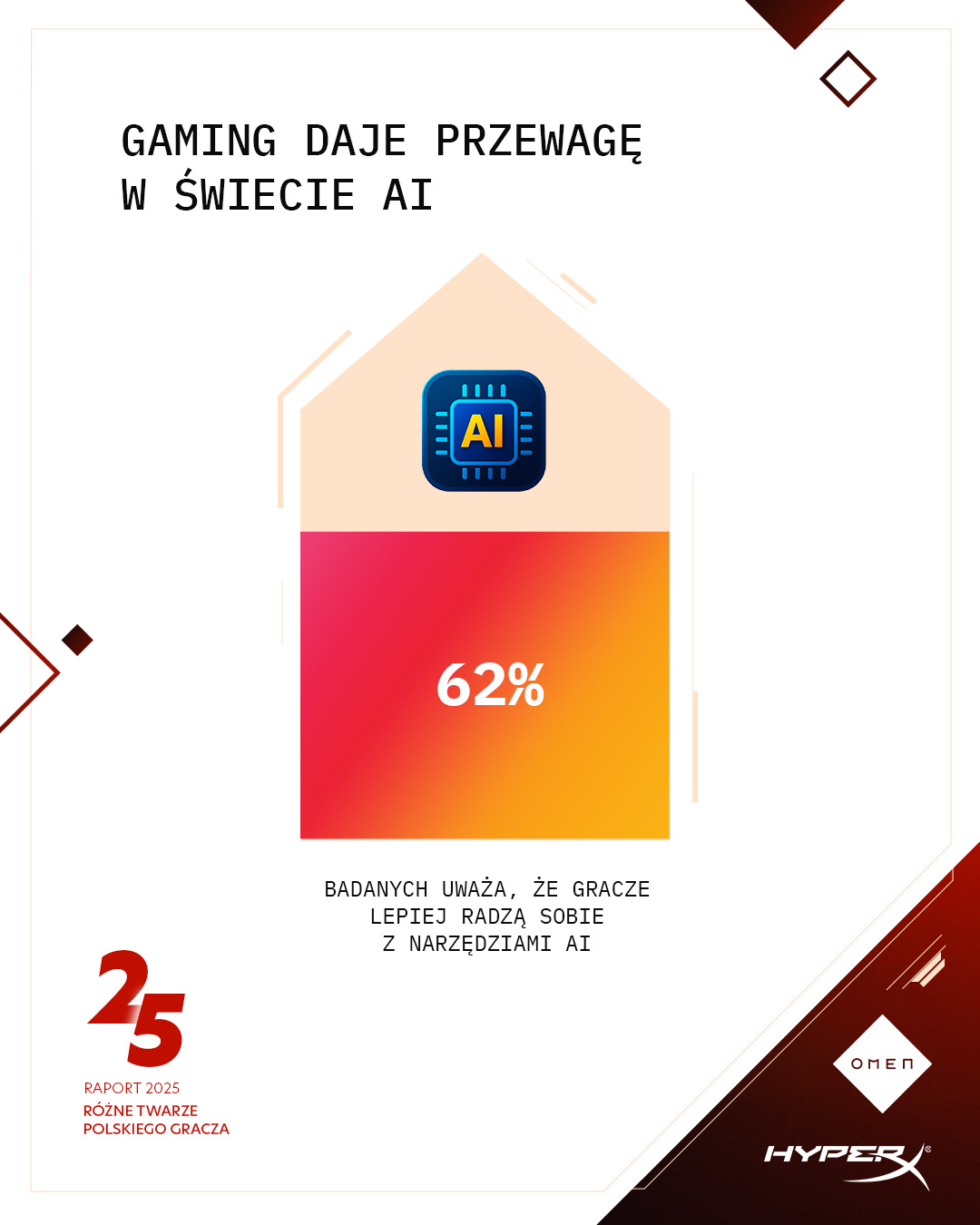 Raport analizuje także stosunek graczy ze środowiska biznesowego do sztucznej inteligencji. Z badań wynika, że AI staje się integralną częścią codziennej pracy. Dwie trzecie badanych graczy ze środowiska biznesowego deklaruje regularnie wykorzystywanie sztucznej inteligencji a 62 % uważa, że gracze mają przewagę w pracy z narzędziami AI (ChatGPT, Copilot, Midjourney). To wyraźny dowód na to, że gaming ułatwia adaptację do wykorzystania nowych narzędzi i wspiera rozwój kompetencji cyfrowych w biznesie.