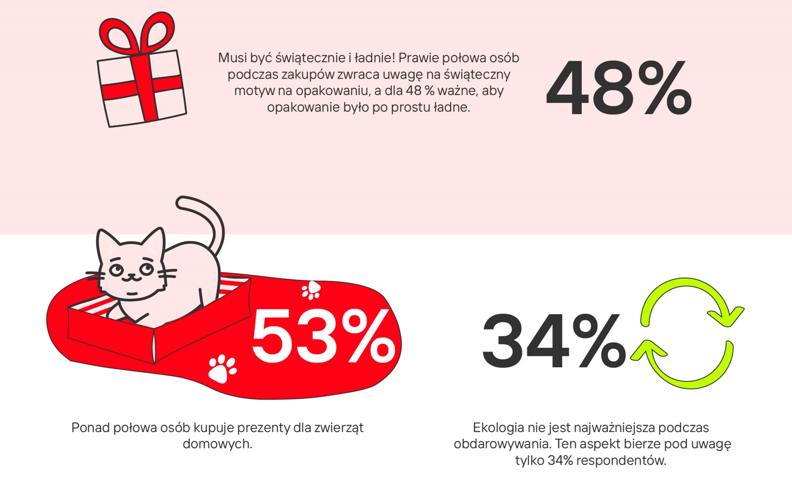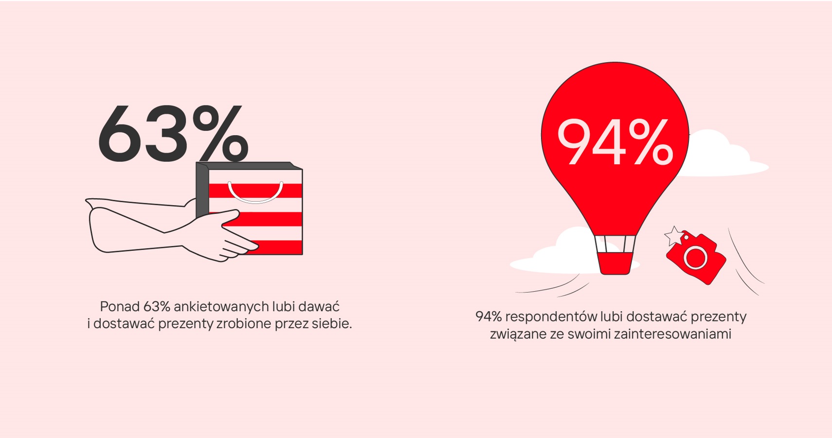 Wyniki ankiety jasno pokazują, że najczęściej prezenty wybieramy samodzielnie (53% osób), a rzadziej szukamy inspiracji w sklepach internetowych (18,7%) czy korzystamy z listy życzeń od bliskich (16,6%). Co ciekawe, ponad połowa ankietowanych zadeklarowała, że kupuje prezenty nie tylko dla członków rodziny czy przyjaciół, ale i dla swoich zwierząt domowych! A czym warto kierować się, wybierając podarunek? Przede wszystkim zainteresowaniami danej osoby. Aż 93,51% uczestników badania wskazało, że przede wszystkim lubią otrzymywać prezenty, które są powiązane z ich pasjami czy hobby.