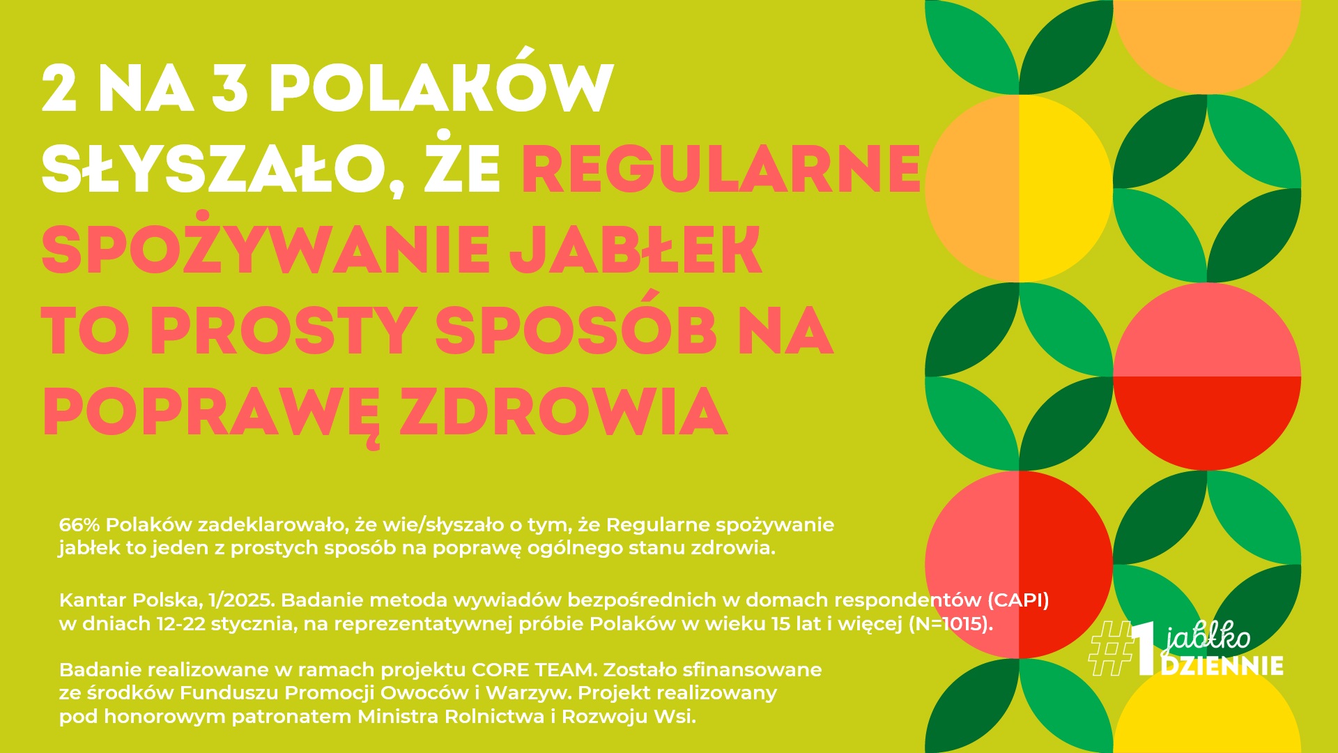 Badania wykazują, że osoby, które regularnie spożywają jabłka, mają większą szansę na dłuższe życie. Jabłka obniżają ryzyko chorób serca, cukrzycy i otyłości. Dwie trzecie Polaków docenia ich walory zdrowotne. Tym istotniejsze jest dziś budowanie nawyków tej regularności. Bo jak to mówią: „jedno jabłko dziennie trzyma lekarza z daleka ode mnie”.