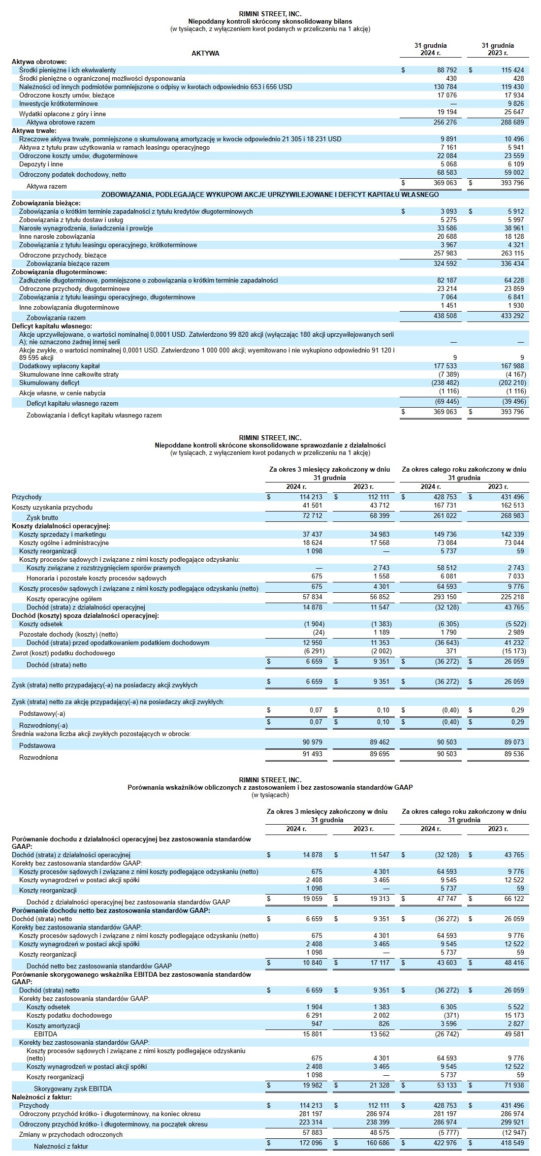 LAS VEGAS--(BUSINESS WIRE)-- Rimini Street, Inc. (Nasdaq: RMNI), dostawca kompleksowego wsparcia w zakresie oprogramowania firmowego oraz innowacyjnych rozwiązań o zasięgu globalnym, wiodący podmiot zewnętrzny świadczący usługi wsparcia dla oprogramowania Oracle, SAP i VMware, ogłosił dzisiaj wyniki finansowe za IV kwartał 2024 roku oraz za rok podatkowy zakończony 31 grudnia 2024 roku.