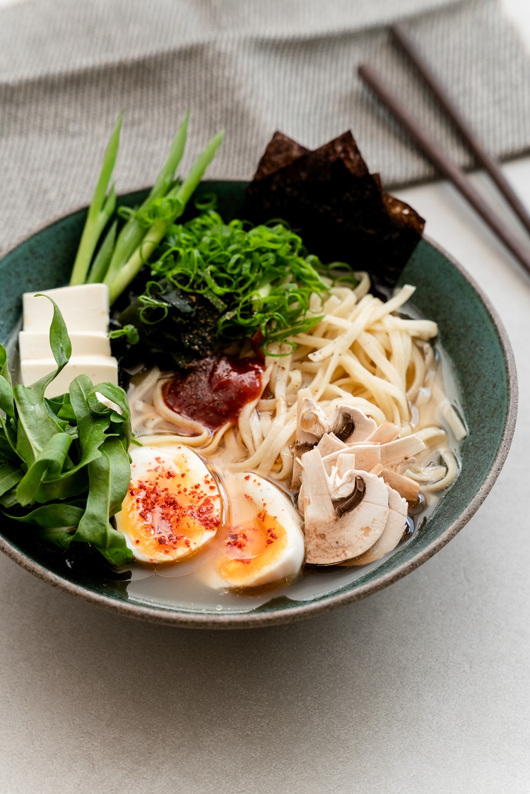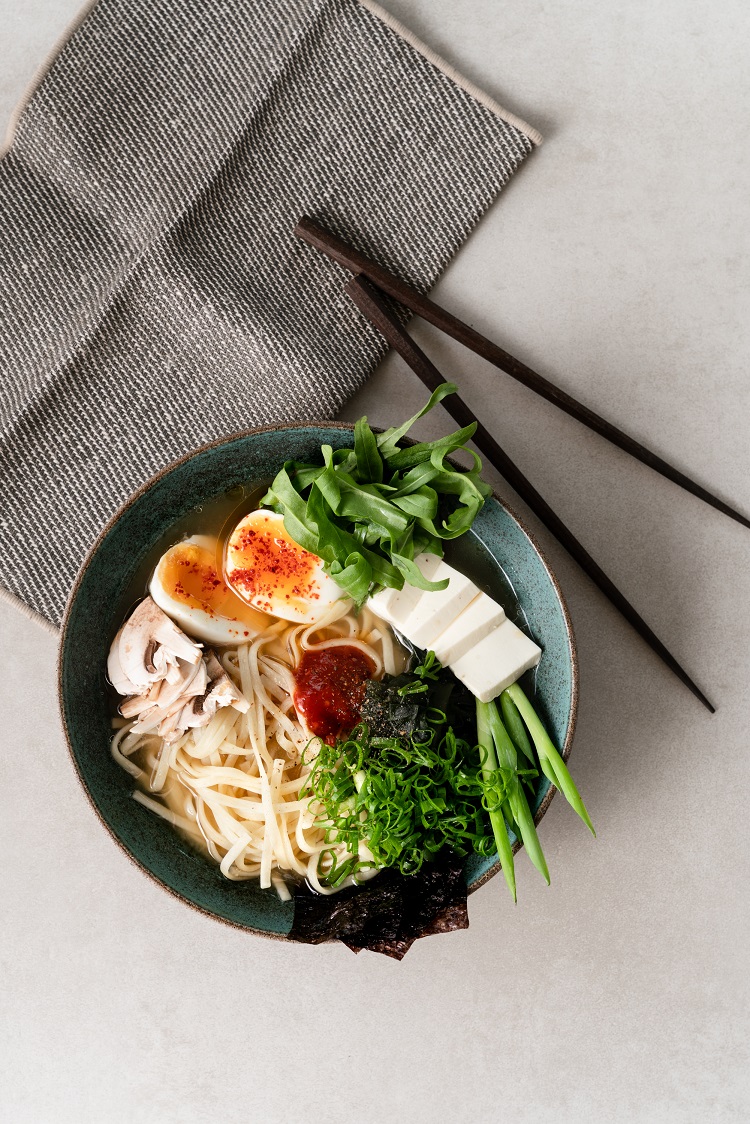 W misce układam ugotowany makaron zalewam go bulionem i dodaje poszczególne dodatki; szczypiorek, jajko gotowane 6.5 min, tofu, płatki surowej pieczarki, rukolę- to na co mam ochotę.