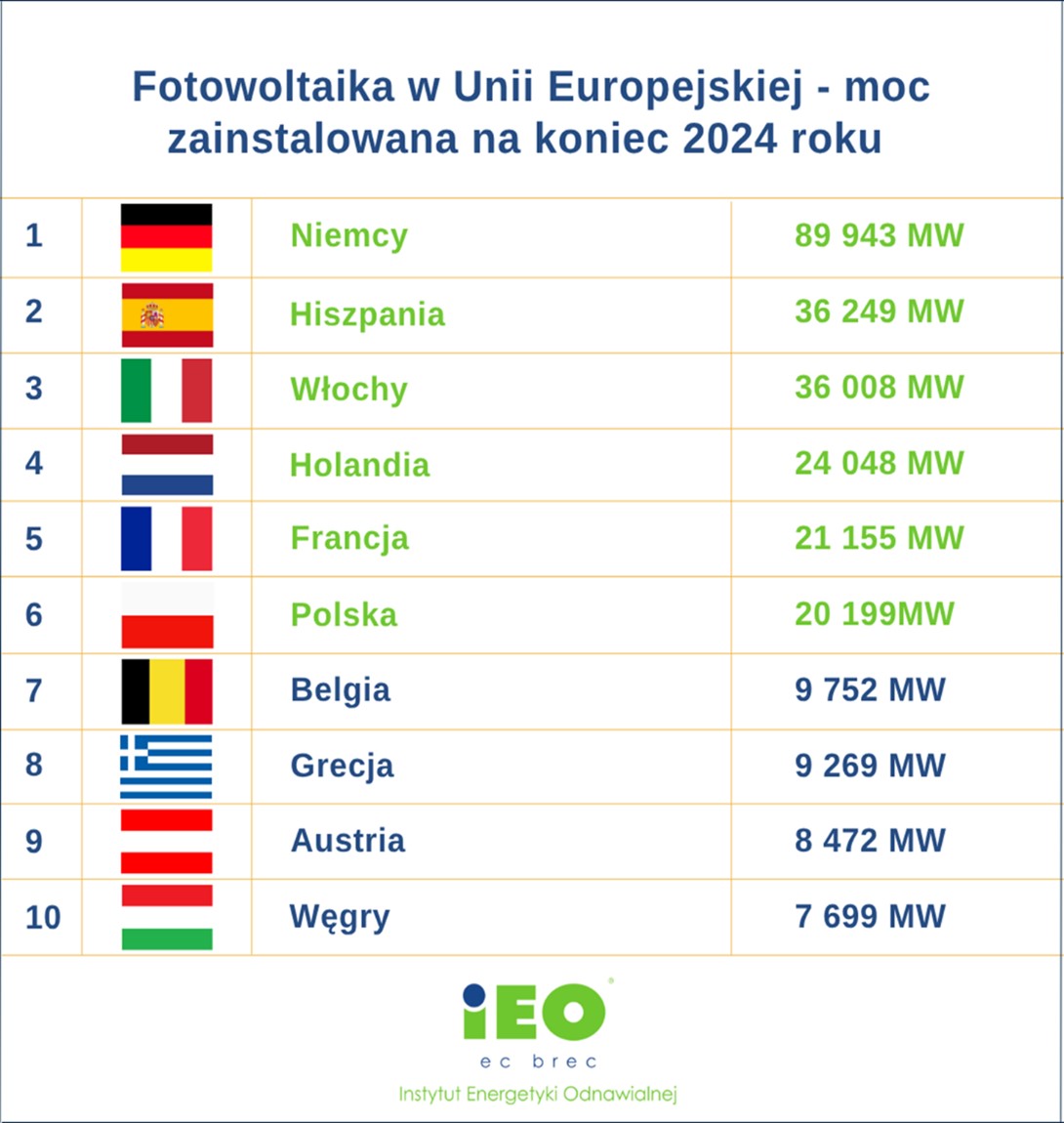 Instytut Energetyki Odnawialnej opublikował XIII edycję raportu „Rynek fotowoltaiki w Polsce 2025”. Wartość inwestycji w moce PV przekroczyła 12 mld zł. Pod względem przyrostu mocy PV w 2024 roku Polska zajęła 5. miejsce w UE i umocniła się na 6. miejscu pod względem skumulowanej mocy zainstalowanej, daleko wyprzedzając kolejne kraje z TOP 10.