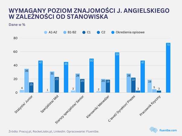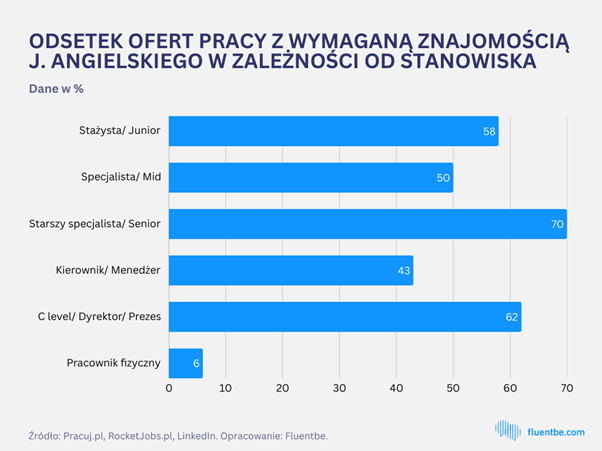 Czy to możliwe, że od stażystów wymaga się takiej samej znajomości języka angielskiego jak od menedżerów? Przegląd ponad 85 tys. ofert pracy z portali Pracuj.pl, RocketJobs.pl oraz LinkedIn, przeprowadzony przez zespół czołowej polskiej szkoły językowej online Fluentbe pokazuje, że tak. Biorąc pod uwagę wszystkie ogłoszenia, znajomość języka angielskiego była niezbędna w połowie wypadków.