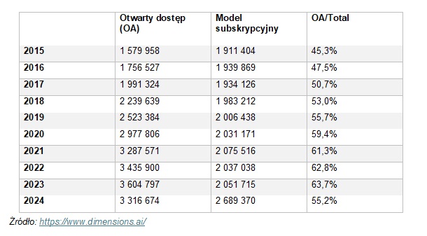 Otwarty dostęp przestaje być niszową ideą, a staje się nowym standardem w publikowaniu naukowym. Według danych Dimensions.ai, w 2020 roku liczba publikacji OA po raz pierwszy przewyższyła globalnie liczbę publikacji w modelu subskrypcyjnym. Był to symboliczny przełom, bo od tego momentu większość globalnego dorobku naukowego stała się otwarcie dostępna. Trend ten utrzymuje się i nasila w kolejnych latach. Jeszcze w 2015 roku artykuły open access stanowiły ok. 45% publikacji, a w 2020 już ponad 59%, a w 2023 osiągnęły 64%. Liczba prac naukowych dostępnych w OA podwoiła się w ostatniej dekadzie, z około 1,6 miliona w 2015 r. do ponad 3,6 miliona w 2023 r., co odzwierciedla zwiększanie zapotrzebowania na nieograniczony dostęp do wiedzy naukowej. Dynamiczny rozwój OA jest stymulowany przez polityki rządowe i grantodawców, którzy coraz częściej wymagają otwartego publikowania. Model Open Access odzwierciedla priorytety Unii Europejskiej: wspieranie innowacji, pluralizm, przejrzystość oraz równość w dostępie do wiedzy. Programy, takie jak Horizon Europe czy inicjatywa Plan S, formułują jednoznaczne wymagania w zakresie natychmiastowego otwartego dostępu do wyników badań finansowanych ze środków publicznych. W efekcie open access stał się dominującym modelem komunikacji naukowej, przekształcając praktyki wydawców, badaczy, instytucji oraz czytelników na całym świecie.