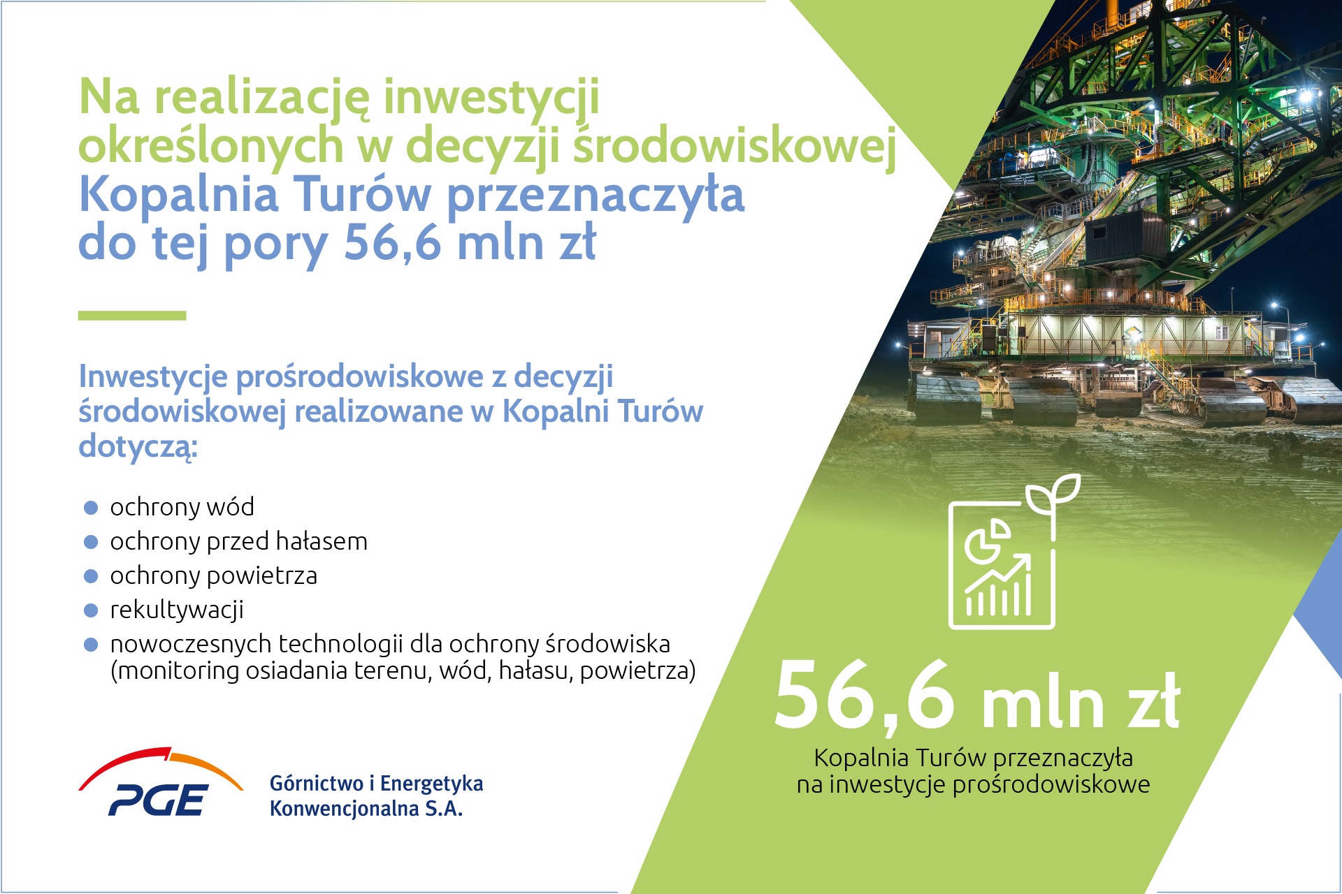 Kopalnia Turów na bieżąco wypełnia zobowiązania z decyzji środowiskowej, wydanej przez Generalnego Dyrektora Ochrony Środowiska, poprzez realizację szeregu inwestycji i działań proekologicznych ograniczających jej wpływ na pobliskie tereny Polski, Czech i Niemiec. Na wszystkie działania kopalni wynikające decyzji środowiskowej przeznaczono do tej pory ok. 56,6 mln zł.