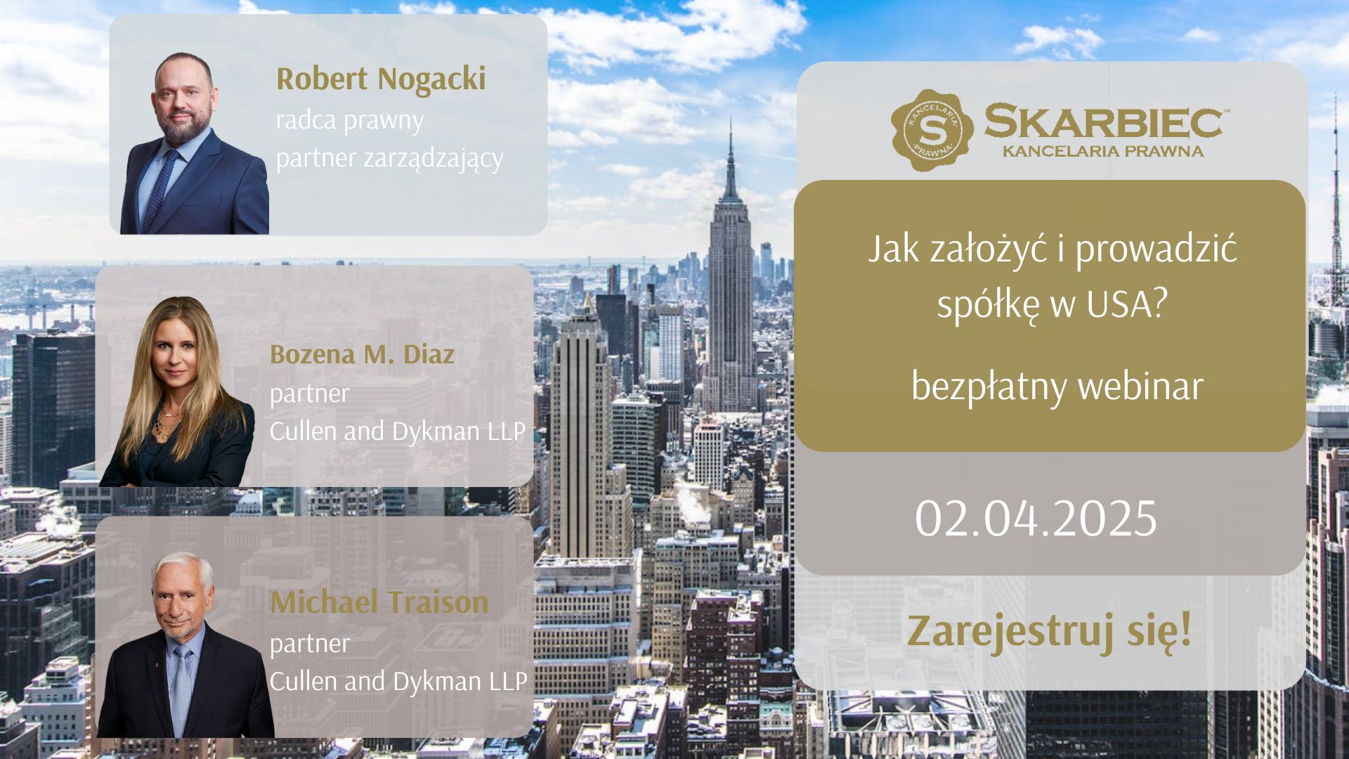 Przedsiębiorcy, którzy chcą dowiedzieć się więcej o korzyściach założenia spółki w USA, o tym które stany są najkorzystniejsze do rejestracji takiej spółki i dlaczego oraz jakie są konsekwencje podatkowe prowadzenia firmy w USA dla rezydenta podatkowego Polski, mają taką szansę. Już 2 kwietnia można skorzystać z bezpłatnego webinaru „Założenie spółki w USA - praktyczny przewodnik dla przedsiębiorców z Polski i UE”, który poprowadzą prawnicy specjalizujący się w zakładaniu spółek w USA: