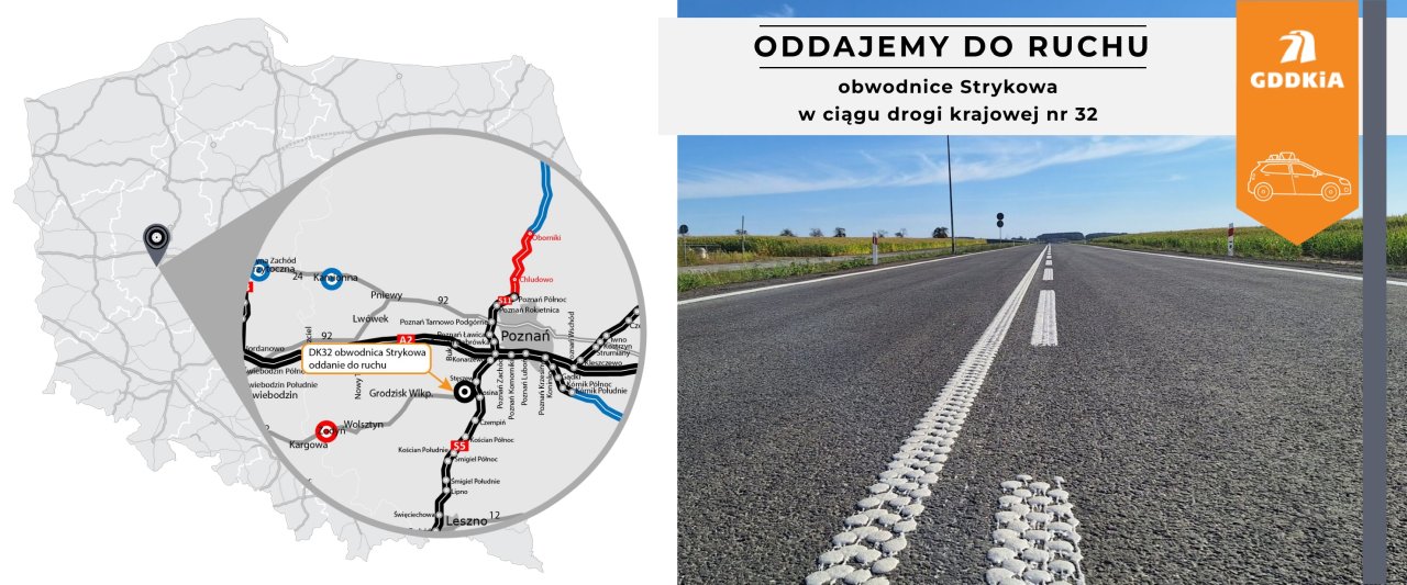 GDDKiA udostępniła do ruchu ponad 3-kilometrową obwodnicę Strykowa w ciągu drogi krajowej nr 32. To już druga obwodnica w Wielkopolsce zrealizowana w ramach rządowego Programu budowy 100 obwodnic na lata 2020-2030 (PB100). Inwestycja została objęta bezzwrotnym wsparciem w ramach Krajowego Planu Odbudowy (KPO).