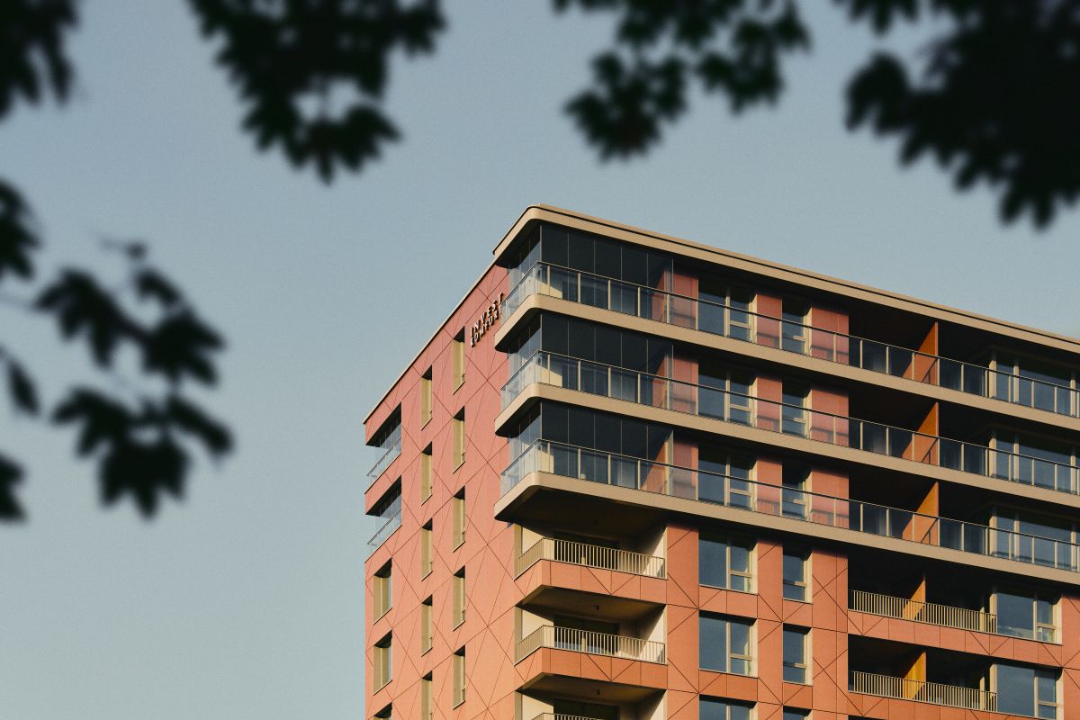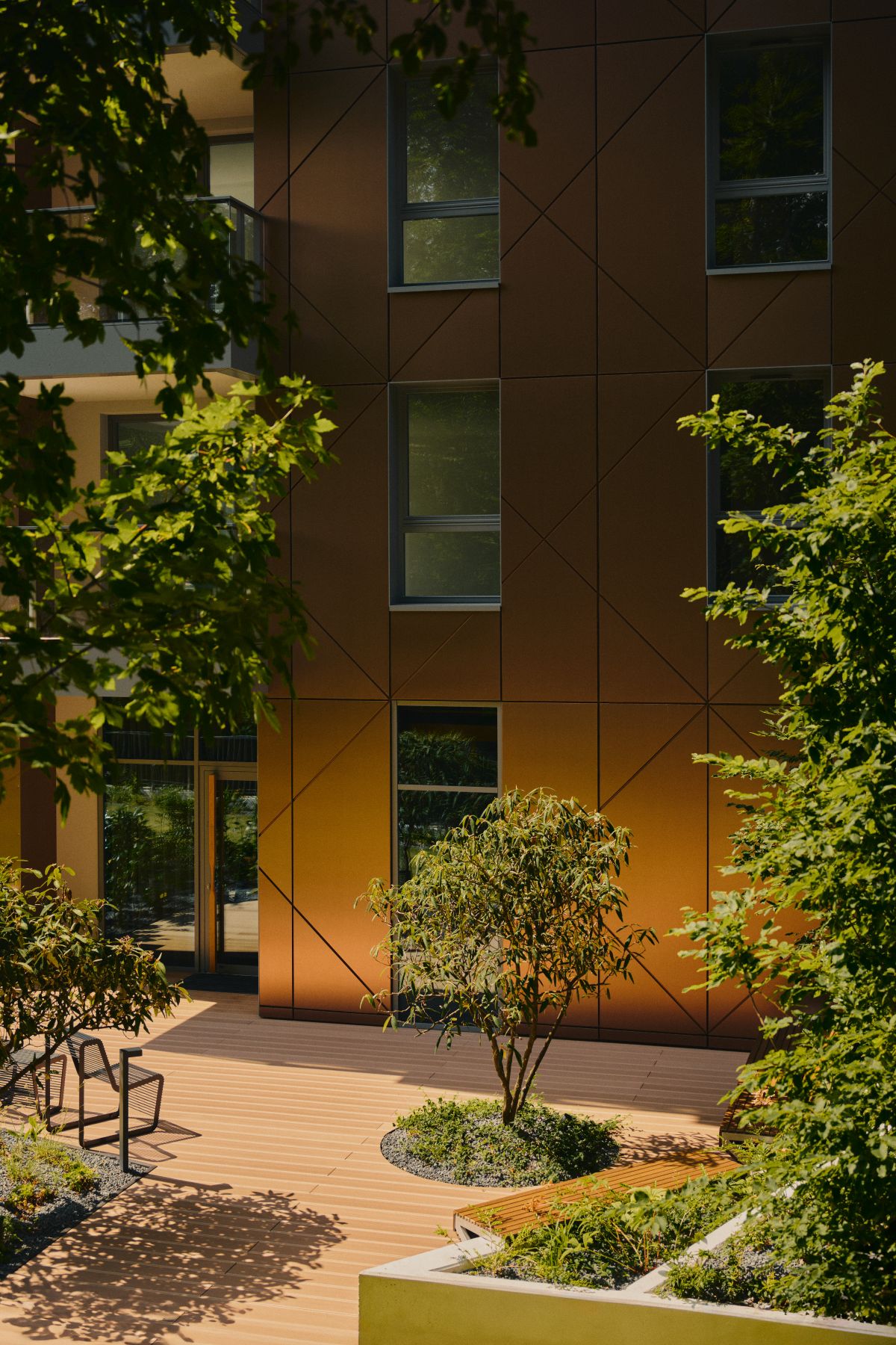 Studio BJK Architekci zaprojektowało dla Małokackiej jedenastopiętrową bryłę zanurzoną w koronach buków. Elewacja w odcieniach satynowanej miedzi z akcentami srebrnej szarości i drewna współbrzmi z otaczającym lasem niezależnie od pory roku. Stal, przeszklenia i miedź tworzą kompozycję wykraczającą poza doraźne trendy. Balkony i loggie wyposażone w lumony zapewniają intymność przy jednoczesnym kontakcie z naturą przez cały rok. Prywatne ogrody otoczone żywopłotami z zimozielonych krzewów dają mieszkańcom kameralną przestrzeń.