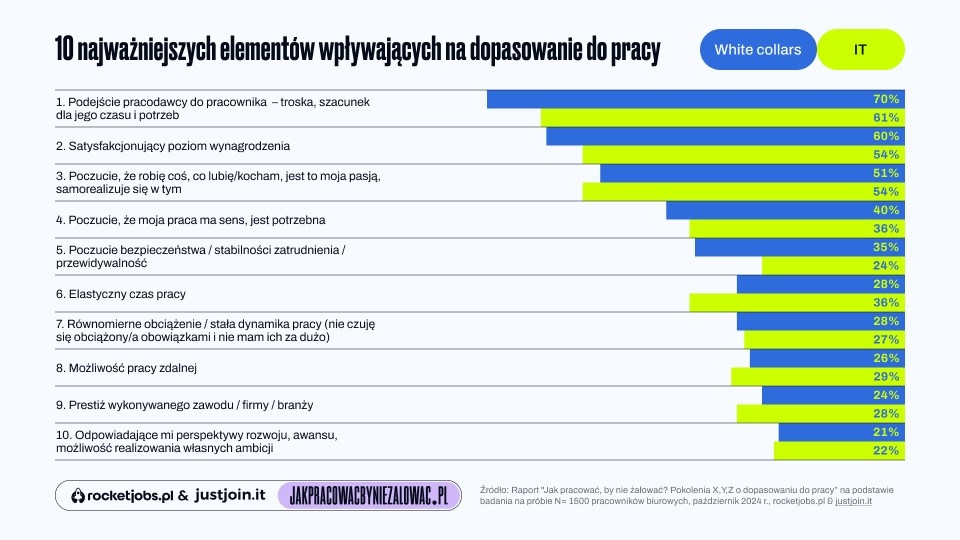 Badanie wykazało wiele spójności w postrzeganiu najważniejszych czynników środowiska zawodowego wśród pokoleń - w każdej grupie wiekowej najwyższą wartością w pracy jest podejście pracodawcy do pracownika, zwłaszcza troska o jego czas i potrzeby - ale też różnic. Dla generacji X i Y na drugim miejscu plasuje się satysfakcjonujące wynagrodzenie, podczas gdy dla Zetek ważniejsza niż finansowa gratyfikacja jest zgodność profesji z osobistymi pasjami, robienie tego, co się lubi lub kocha. Symptomatycznym jest, że aspekty, w których pokolenie Z jest najbardziej dopasowane (zadowolone z pracy), nie są dla nich najważniejsze. Podobnie jest z tymi, w których nie są dopasowani (najwięcej niezadowolonych) - one też nie są dla nich kluczowe poza jednym - elastycznym czasem pracy. Z kolei dla Igreków i Iksów kluczowymi elementami poczucia, że są dopasowani do pracy, są stabilność zatrudnienia i poczucie bezpieczeństwa. Wartym zauważenia jest również fakt, że postać przełożonego jest jednym z najmniej ważnych czynników dla wszystkich pokoleń.
