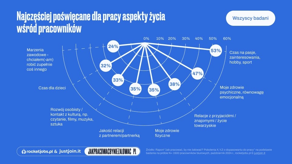 Ponad jedna trzecia pracujących deklaruje, że musiała poświęcić coś ważnego dla swojej kariery zawodowej (34 proc.). Przede wszystkim czas na pasje, hobby, sport (53 proc.), zdrowie psychiczne i równowagę emocjonalną (47 proc.), a także życie towarzyskie i relacje z przyjaciółmi (38 proc.). Wśród sfer, które ucierpiały na zbytnim zaangażowaniu w pracę zawodową, na równi znalazły się też relacje z partnerem/partnerką i zdrowie fizyczne (po 35 proc.), rozwój osobisty wskazało 33 proc. respondentów, a czas dla dzieci - 32 proc. Smutnym wnioskiem jest, że jedna czwarta pracowników poświęciła swoje marzenia - chcieli zajmować się zawodowo czymś zupełnie innym.