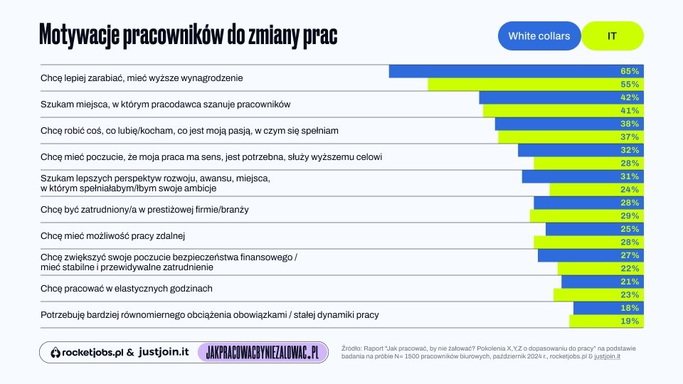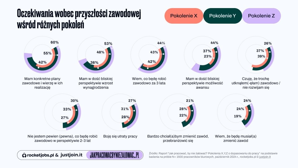 „Wydany przez nas raport ma na celu zwrócenie uwagi na problem odnalezienia się w dzisiejszej złożonej rzeczywistości zawodowej, pogodzenia się z koniecznością zmiany pracy, a nawet branży kilkukrotnie w trakcie cyklu kariery oraz szukaniu kompromisu między potrzebami własnego >>ja<< i rynku pracy, który dynamicznie się zmienia. Dostarczone przez nas dane nie tylko obrazują bieżącą sytuację, ale również wskazują na główne wyzwania, jakie stoją przed pracodawcami. Z badań wynika, że choć aż ponad 80 proc. pracowników jest relatywnie zadowolona ze swojej sytuacji zawodowej, istnieją obszary, które wciąż wymagają poprawy - szczególnie te związane z podejściem do pracownika i jego czasu, dbałością o jego potrzeby. Pokolenia Y i Z mają o wiele wyższe oczekiwania w tym zakresie niż ich poprzednicy, co oznacza, że pracodawcy muszą zrewidować swoje podejście do zmieniających się potrzeb kandydatów” - mówi Piotr Nowosielski, CEO rocketjobs.pl i justjoin.it.