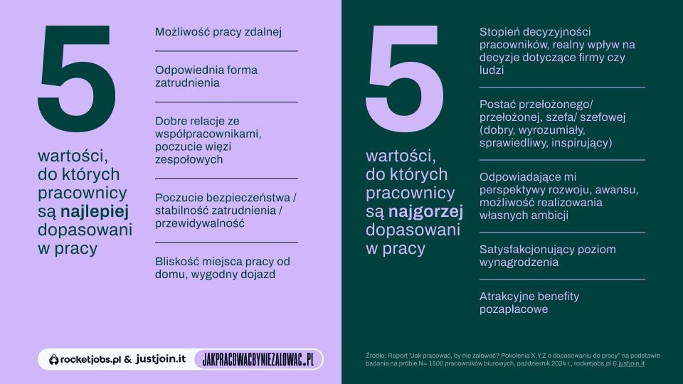 7 na 10 pracowników biurowych stawia wyżej szacunek i troskę pracodawcy niż satysfakcjonującą ich wysokość wynagrodzenia - wynika z najnowszego raportu portali z ofertami pracy rocketjobs.pl i justjoin.it „Jak pracować, by nie żałować. Pokolenia X, Y i Z o dopasowaniu do pracy”. Mimo że aż 88 proc. respondentów względnie dobrze ocenia swoje dopasowanie do pracy, kluczowe dla nich potrzeby nie są w pełni zaspokajane. Tylko 47 proc. jest zadowolona z podejścia pracodawcy, niewiele ponad połowa badanych (55 proc.) czuje, że ich praca ma sens, a tylko 53 proc. deklaruje, że się w niej realizuje. Badanie objęło pracowników z branż umysłowych i IT. Partnerami honorowymi publikacji są ManpowerGroup i fundacja IT Girls.