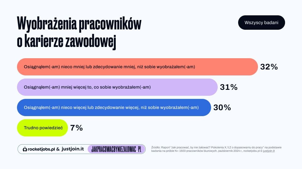 Respondentów zapytano też o poziom realizacji zawodowych wyobrażeń z przeszłości. Wyniki wskazują na dużą różnorodność doświadczeń pracowników w odniesieniu do ich początkowych ambicji i rzeczywistych osiągnięć zawodowych. Badani niemal po równo podzielili się na tych, których kariera przerosła pierwotne oczekiwania (30 proc.), tych, którzy osiągnęli mniej więcej to, co sobie wyobrażali (31 proc.) i tych, którzy osiągnęli zawodowo mniej, niż przewidywali (32 proc.). Zaledwie 7 proc. pracowników odpowiedziało, że nie miało żadnych wyobrażeń o swojej ścieżce zawodowej.