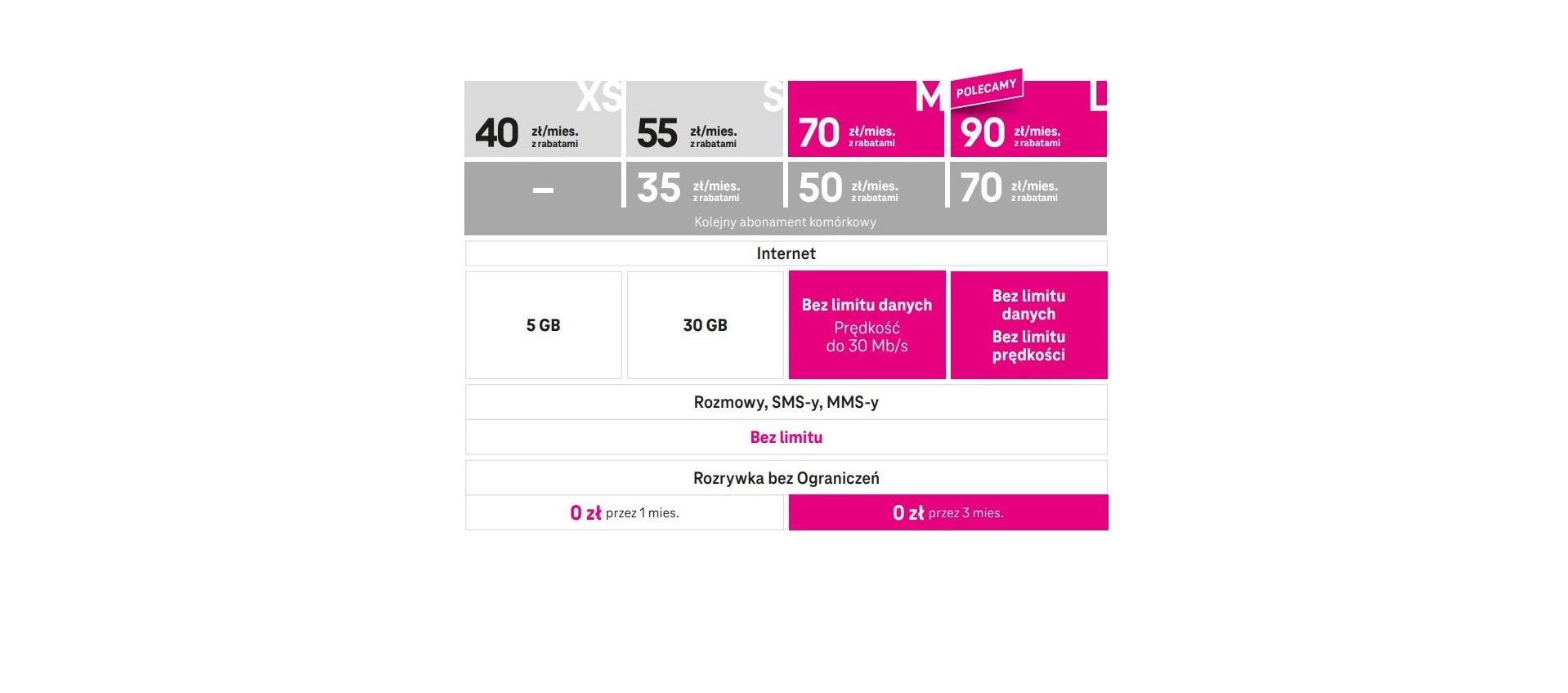 Z kolei obecni klienci mobilnych usług głosowych, którzy mają już jedną z taryf nielimitowanych, dokupując kolejny abonament w opcjach „M Nielimitowana” lub „L Nielimitowana”, otrzymują 6 miesięcy abonamentu za 0 zł.