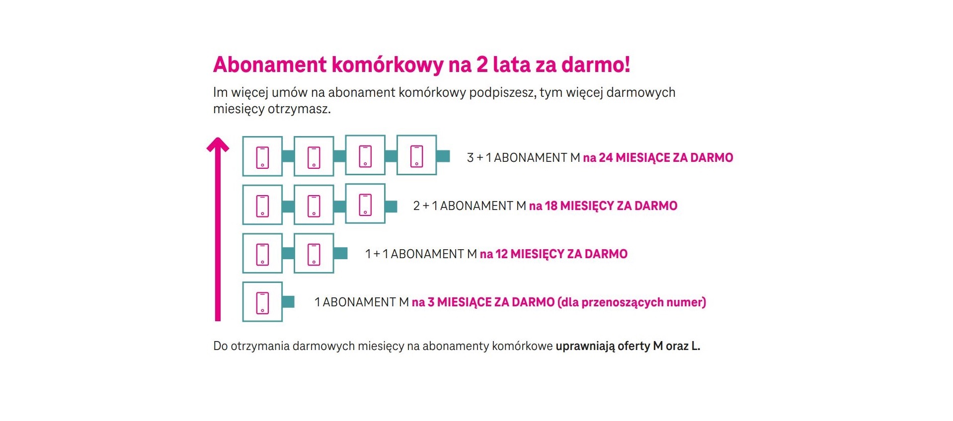 I tak, dokupując lub przenosząc kilka abonamentów w pakiecie umów w opcji „M Nielimitowana”, klienci mogą otrzymać nawet 24 miesiące za darmo na jeden z abonamentów. Zasada jest prosta, im więcej podpisanych umów, tym więcej darmowych miesięcy na jeden z abonamentów. Podobnie promocja działa w przypadku wyboru oferty „L Nielimitowana” z tą różnicą, że w okresie promocyjnym opłata za abonament komórkowy wyniesie 20 zł miesięcznie nawet przez 24 miesiące.