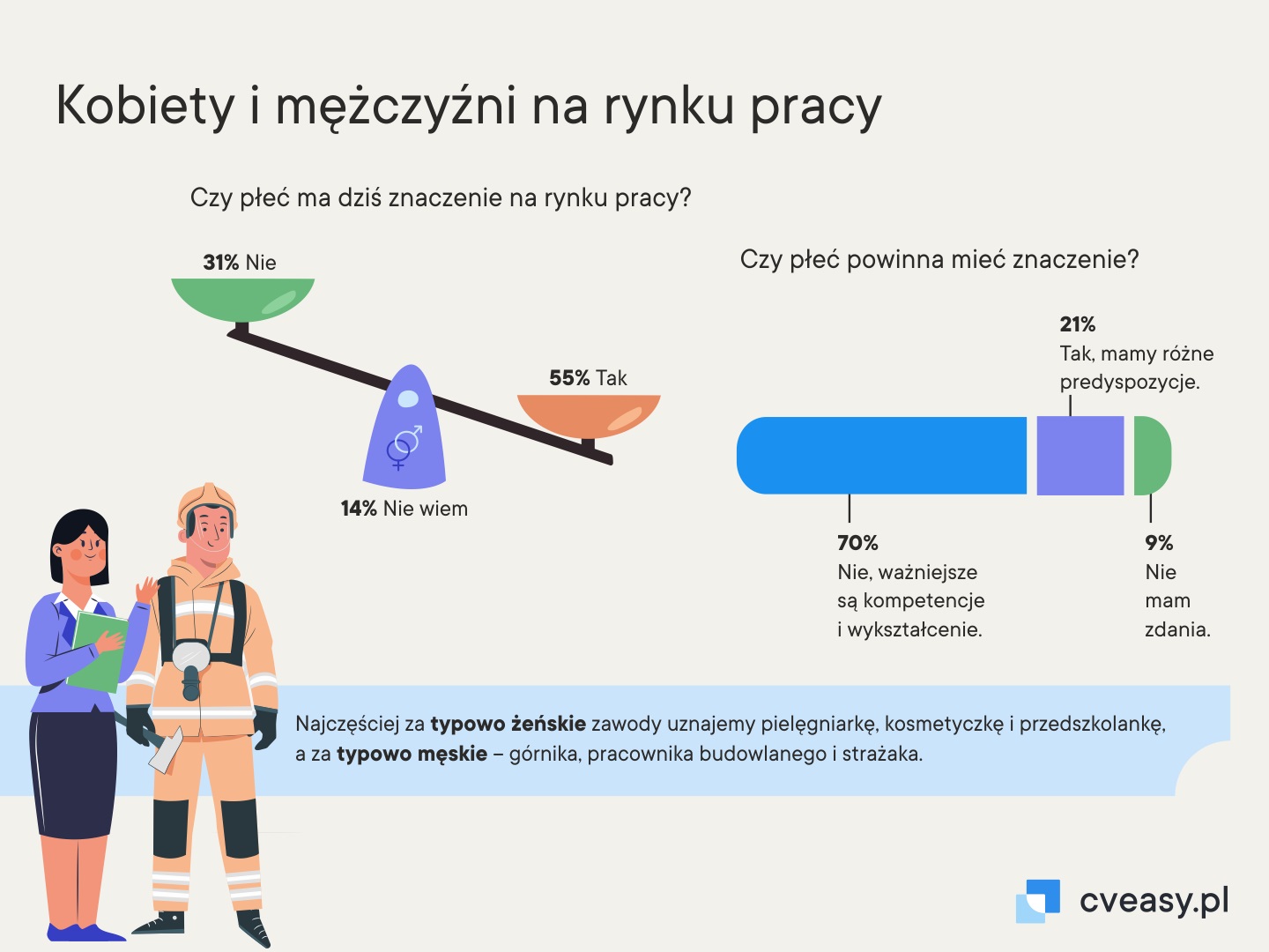 Wyniki badania pokazują, że nadal wielu dzieli ścieżki kariery na te, którymi wypada podążać przedstawicielom konkretnych płci. Najczęściej za typowo żeńskie profesje uznajemy pielęgniarkę, kosmetyczkę i przedszkolankę, a za typowo męskie - górnika, pracownika budowlanego i strażaka. Zawody sfeminizowane są związane z rolami, które społeczeństwo stereotypowo przypisuje kobietom - opieką zdrowotną, pomocą społeczną, dbałością o urodę czy edukacją.