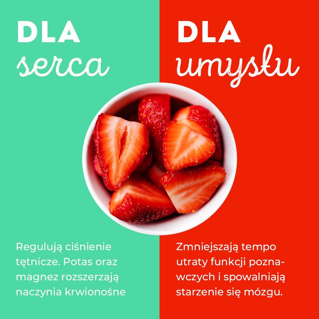 Stan zapalny jest przyczyną wielu chorób przewlekłych, w tym miażdżycy i nowotworów. Truskawki są bogate w polifenole, takie jak elagotaniny i kwercetyna, które redukują stres oksydacyjny i stan zapalny. W jednym z badań ich regularne spożywanie przez osiem tygodni obniżyło poziom markerów stanu zapalnego o 18%. Wszyscy jesteśmy narażeni na stany zapalne w organizmie, dlatego ważne jest, aby regularnie sięgać po te owoce przez cały rok. Na rynku mamy szeroki wybór przetworów owocowych, takich jak truskawki liofilizowane czy mrożone, to także wartościowe produkty, nie rezygnuj z truskawek po sezonie. Już 100 gramów truskawek zapewni nam całodzienne pokrycie zapotrzebowania na witaminę C, która także ma właściwości przeciwzapalne. To bardzo prosty i smaczny sposób, by każdego dnia działać przeciwzapalnie.