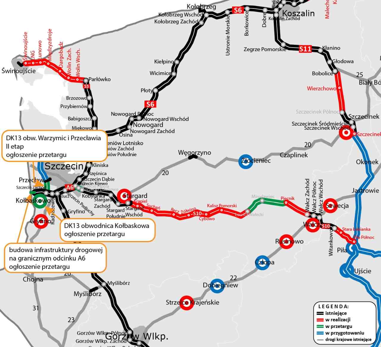 Do publikacji w Dzienniku Urzędowym UE GDDKiA wysłała ogłoszenie o przetargu realizację II etapu obwodnicy Przecławia i Warzymic w ciągu DK13 (nowy węzeł Szczecin Zachód na autostradzie A6), obwodnicy Kołbaskowa w ciągu DK13 oraz budowę infrastruktury drogowej na granicznym odcinku A6. Przetarg obejmuje łącznie te trzy zadania, które będzie realizował jeden wykonawca.