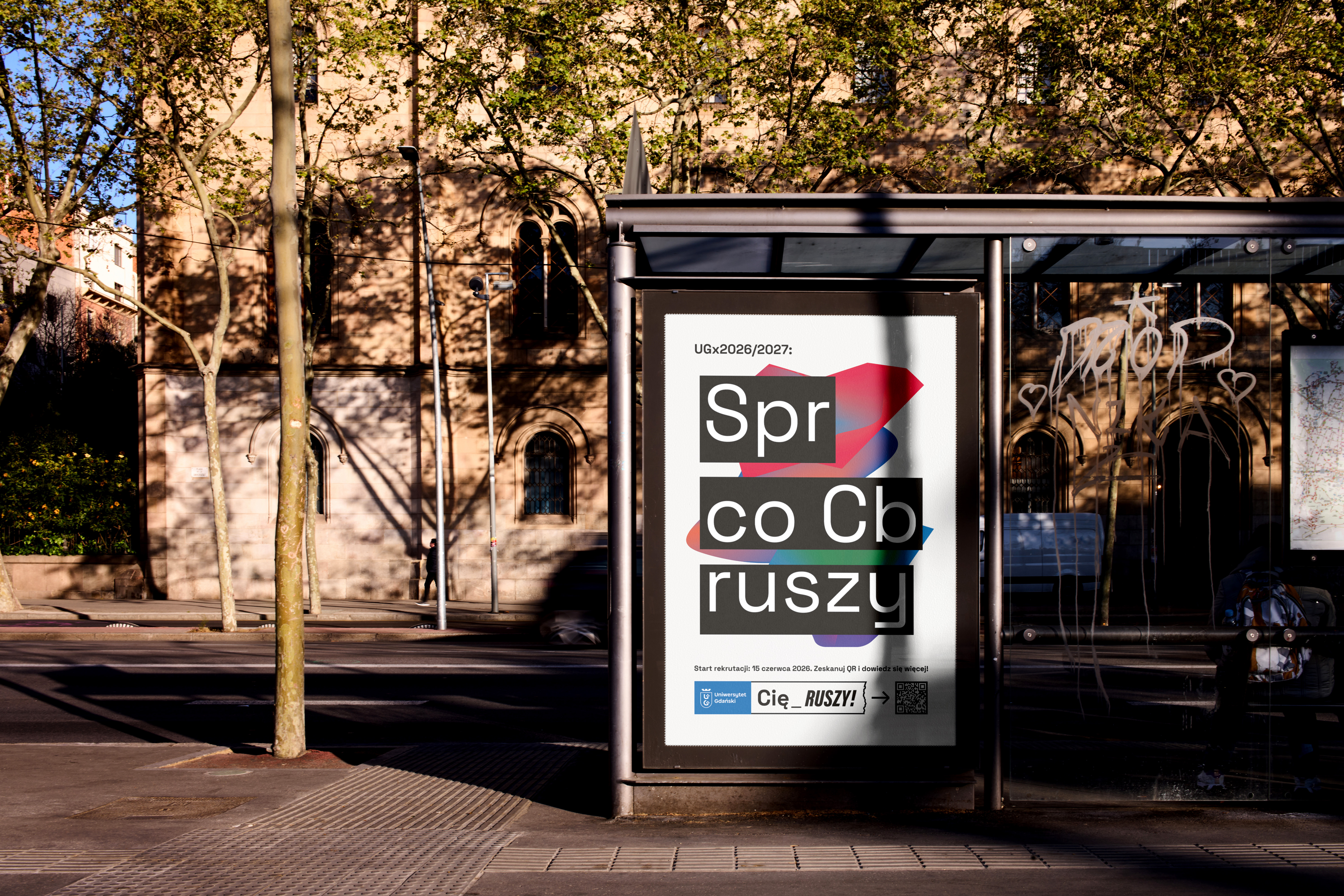 Uniwersytet Gdański rozpoczyna kampanię rekrutacyjną na rok akademicki 2026/2027. Projekt odchodzi od klasycznej konwencji komunikacji uczelnianej na rzecz języka zaczerpniętego ze świata festiwali muzycznych - i z komentarzy, Discorda, czatów. Już samo hasło teasera - „Spr co Cb ruszy” - jest zapisane w sposób, w jaki piszą nastolatkowie: bez zbędnych liter, w skrócie, z pominięciem samogłosek. Odpowiedzią, która pada w fazie reveal, jest claim: „UG Cię ruszy”.