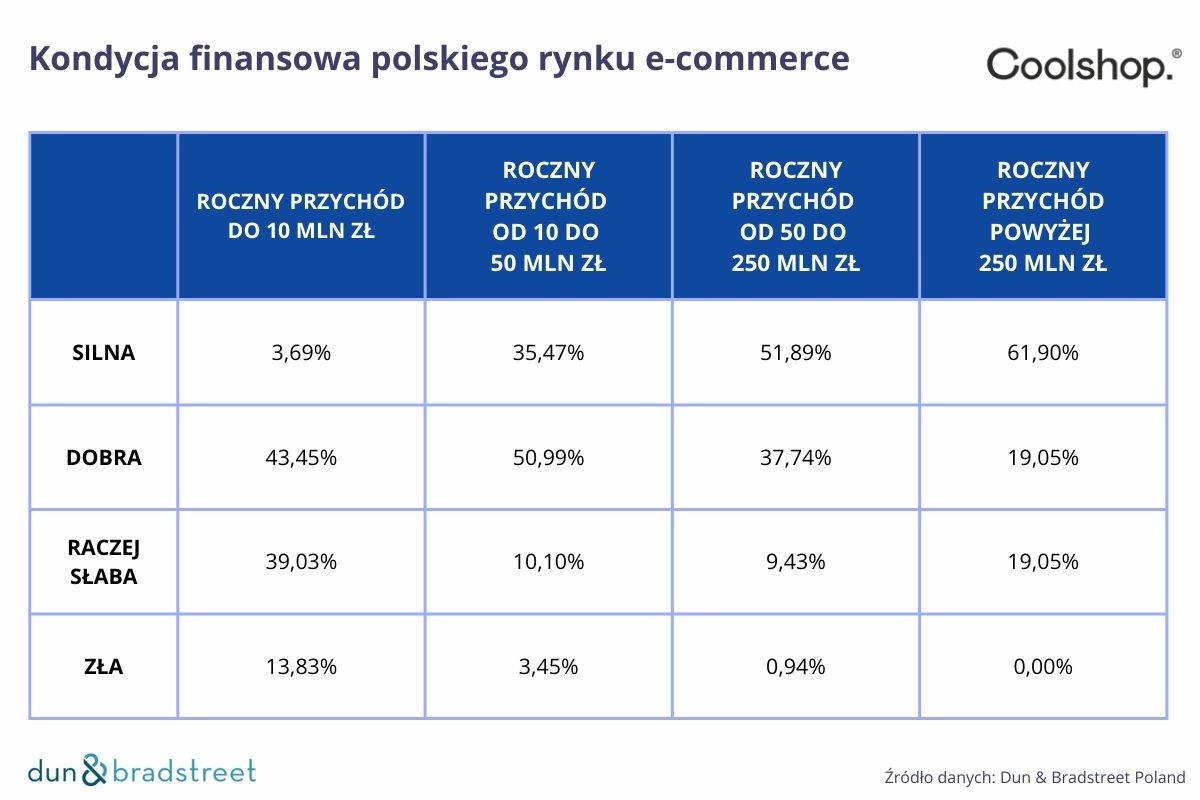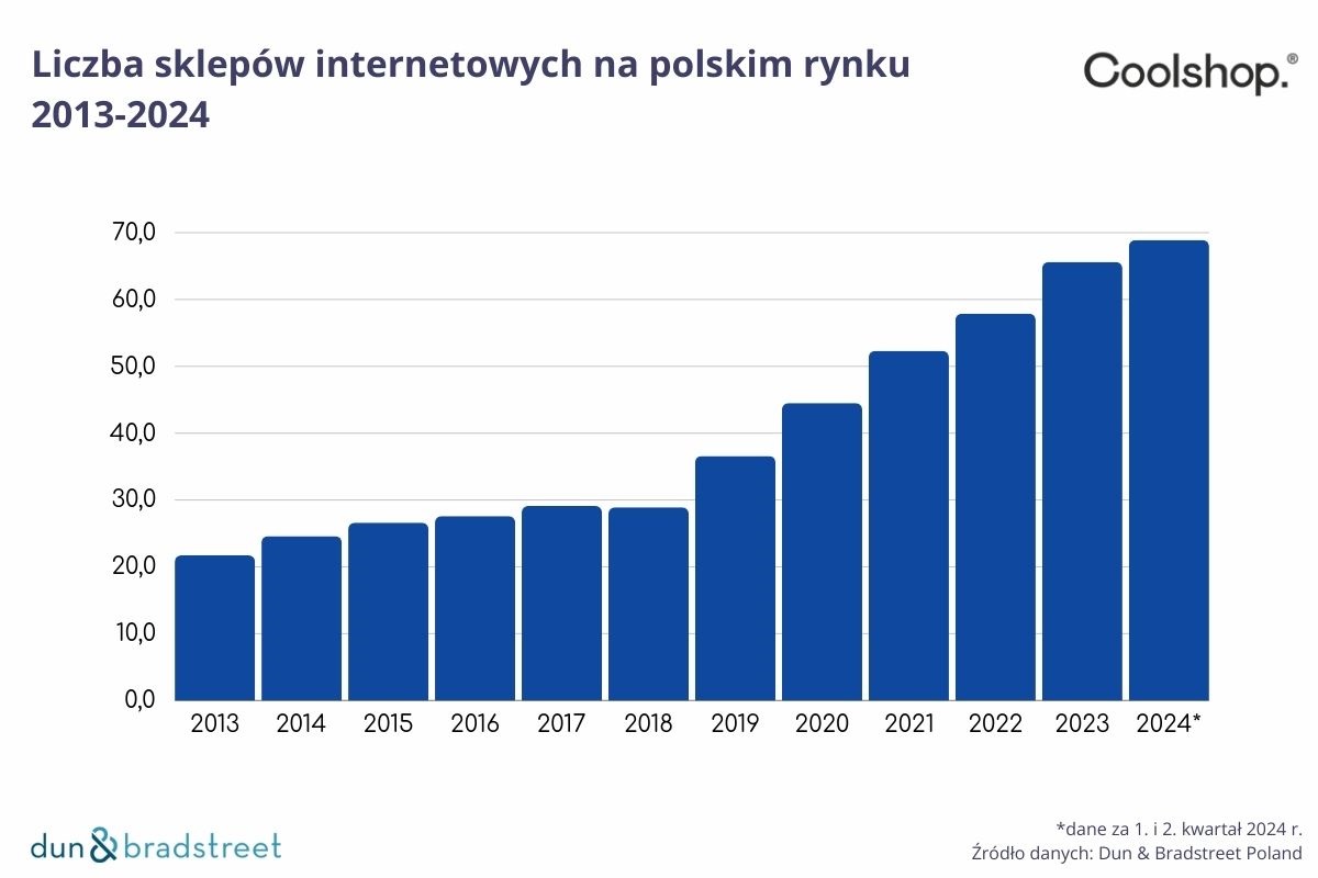 Dynamika rozwoju polskiego rynku e-commerce w pierwszej połowie 2024 r. spadła w porównaniu do analogicznego okresu roku ubiegłego, ale i tak na koniec roku liczba zarejestrowanych w tej kategorii podmiotów zapewne przekroczy 70 tys. Według analizy przeprowadzonej na zlecenie skandynawskiego e-commerce’u Coolshop handel internetowy jest czwartą najpopularniejszą w Polsce branżą pod względem liczby nowo zakładanych firm. Najlepiej radzą sobie średnie podmioty o rocznych przychodach między 10 a 250 mln zł - w dobrej sytuacji finansowej jest niemal 90 proc. z nich.