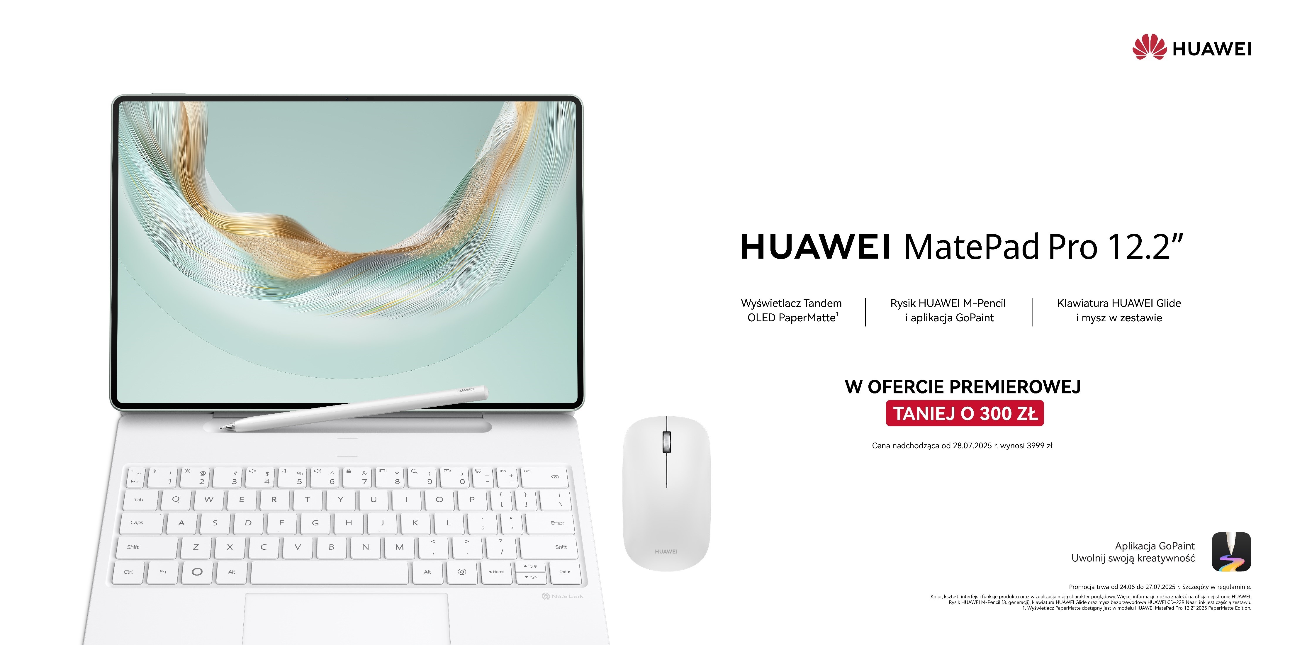 Huawei CBG Polska wprowadza na rynek najnowszą generację flagowych tabletów - HUAWEI MatePad Pro 12.2” 2025. Dzięki akcesoriom dołączonym w zestawie: klawiaturze, rysikowi i myszce bezprzewodowej, sprzęt ten zapewnia wręcz laptopową funkcjonalność. Matowy wyświetlacz Tandem OLED PaperMatte zapewnia precyzję pisania i rysowania niczym na papierze, a także umożliwia użytkowanie w każdym miejscu, nawet bardzo nasłonecznionym. Obsługa ultraszybkiego Wi-Fi 7, długi czas pracy na baterii oraz kompaktowa, lekka konstrukcja pozwalają na efektywne działanie i tworzenie w podróży. Darmowe aplikacje - GoPaint i HUAWEI Notatki - umożliwiają rozwijanie pasji i zarządzanie codziennymi zadaniami. Wszystko to zamknięte zostało w pięknym i praktycznym urządzeniu, które funkcjonuje jako komputer, szkicownik i notatnik w jednym.