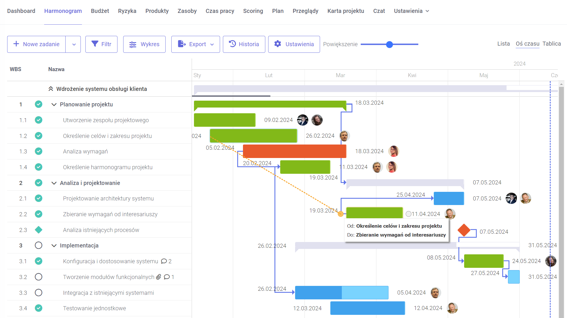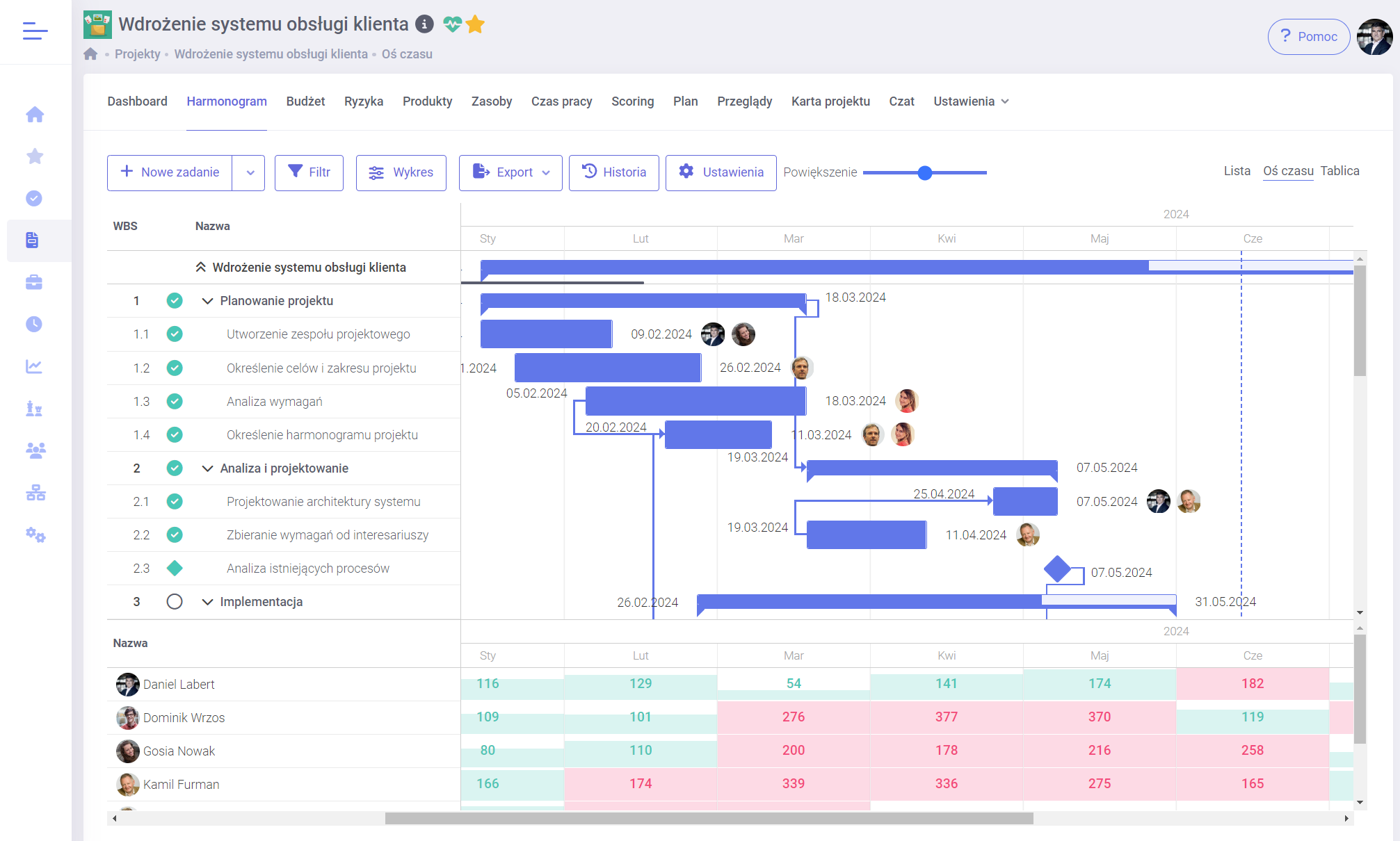 - harmonogram projektu z zaawansowanymi funkcjami budżetowania;