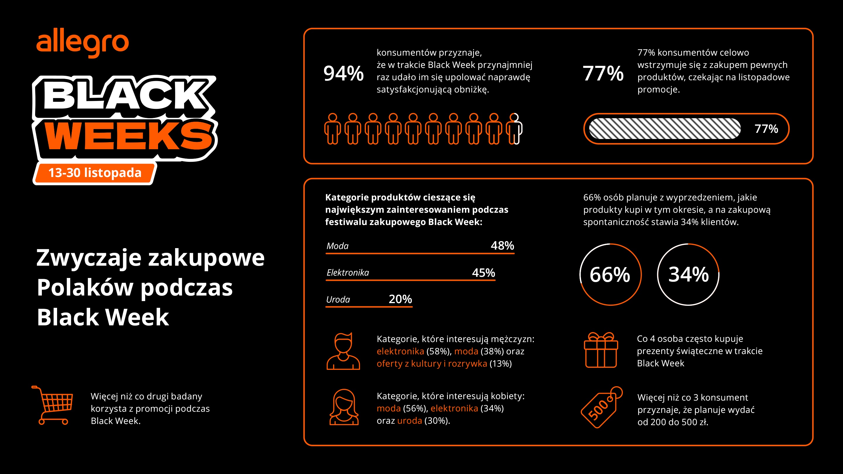 * Badanie „Black Weeks 2023” zostało zrealizowane przez SW Research na zlecenie Allegro. Przeprowadzono 1010 ankiet z reprezentatywną ze względu na płeć, wiek i miejsce zamieszkania próbą dorosłych Polaków. Badanie zostało zrealizowane w formie wywiadów online (CAWI) na panelu internetowym SW Panel w dniach 31.10-02.11. 2023 r.