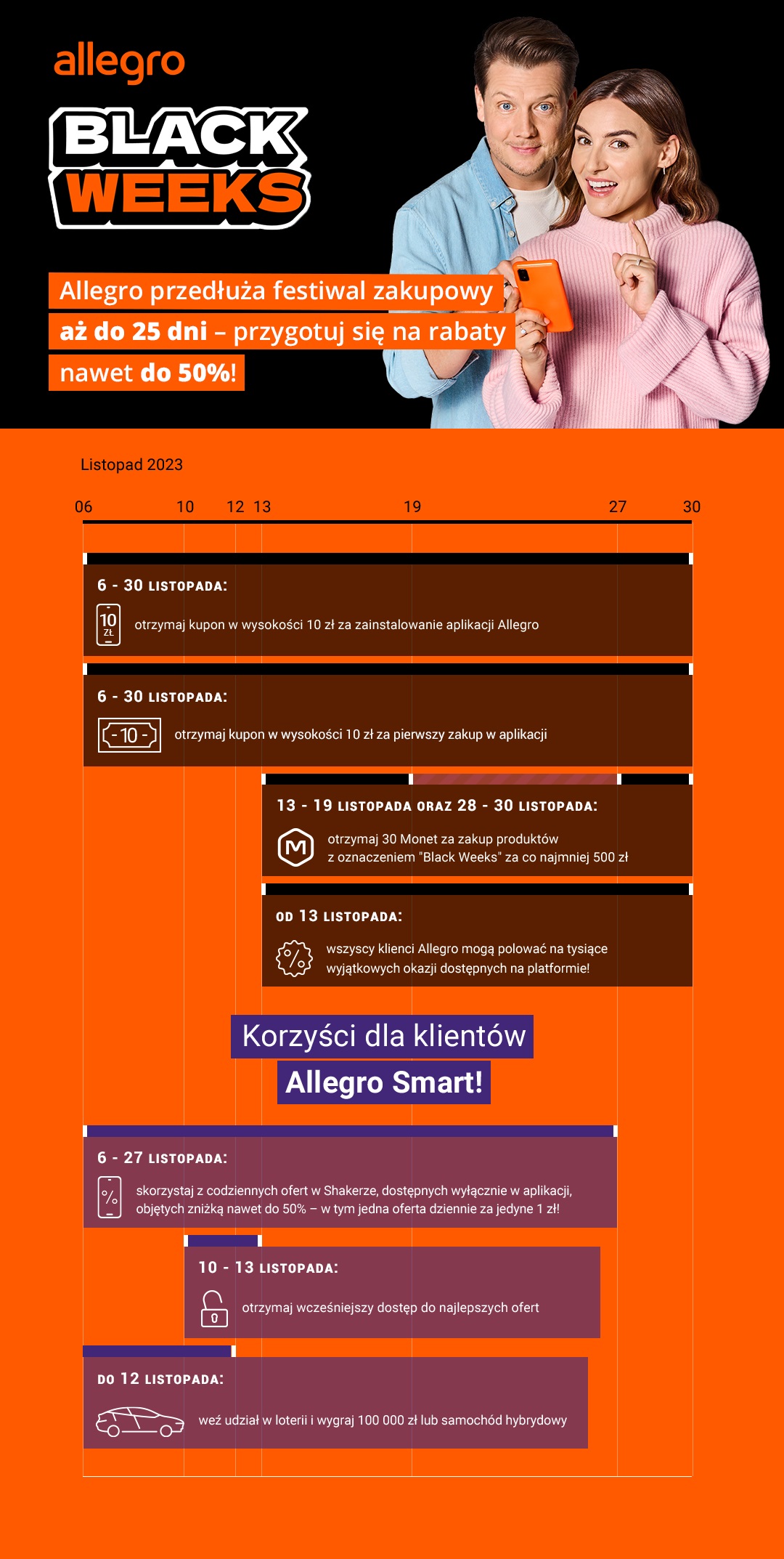 Jak pokazało badanie Allegro, więcej niż co drugi badany przyznaje, że korzysta z promocji podczas festiwali zakupowych Black Week. Wychodząc naprzeciw oczekiwaniom klientów, Allegro wydłużyło największe święto zakupów na platformie aż do 25 dni - w tym roku Allegro Black Weeks potrwa aż do 30 listopada.